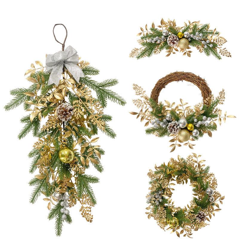 Simulation Pine Needles Rattan Christmas Gold Coloured Ball Leaves Pine Cones Indoor Fireplace Wall Hanging Decoration