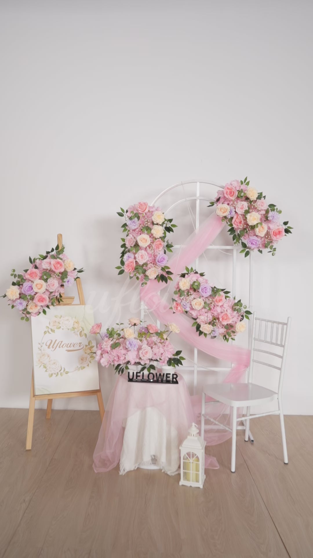 Uflower Artificial Pink Purple Rose Green Leaf Flower Row Wedding KT Backdrop Decor